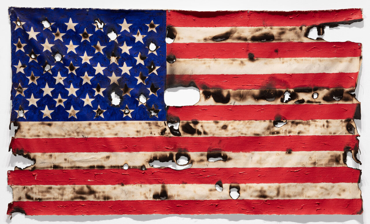 The flags are constructed in different materials, styles, and varying levels of completion: some are ripped and threadbare, some burnt, and some are stylistic recreations of the design. Looking through the works, the criminal implications of these defaced flags instantly came to mind, making the show all the more defiant and shocking. Repetition becomes an art form even if at a closer look none of the flags are the same.