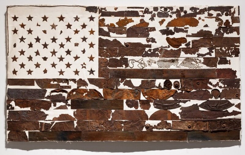 Clark expresses, “As a child, my heart would become full whenever I saw the flag waving in the breeze. I was proud and it was my understanding that all who saw ‘our’ flag could and should only love it as citizens and, if not of our country, envy those who were protected by it. I was taught that all citizens, under this flag, would enjoy all rights and freedoms under the constitution.” The American flag has been a part of Clark’s artistic vocabulary for the last 20 years, and these works are a way for her to come to terms with the “unrequited love” she feels for it.