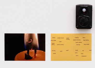 In a corner of the room is a small photograph by Rosa Aiello depicting a burning candle, zoomed in to show just the top of the candle’s melting wax and the flame. Beside it is a list of words related to fire: “crackling”, “flames”, “people screaming”, “black smoke” and so on. Above this list is an infrared motion-activated speaker, that plays a recording of a woman saying insignificant words. The combination of the robotic, emotionless, disembodied voice with these troubling printed words gives this section of the gallery a foreboding atmosphere.