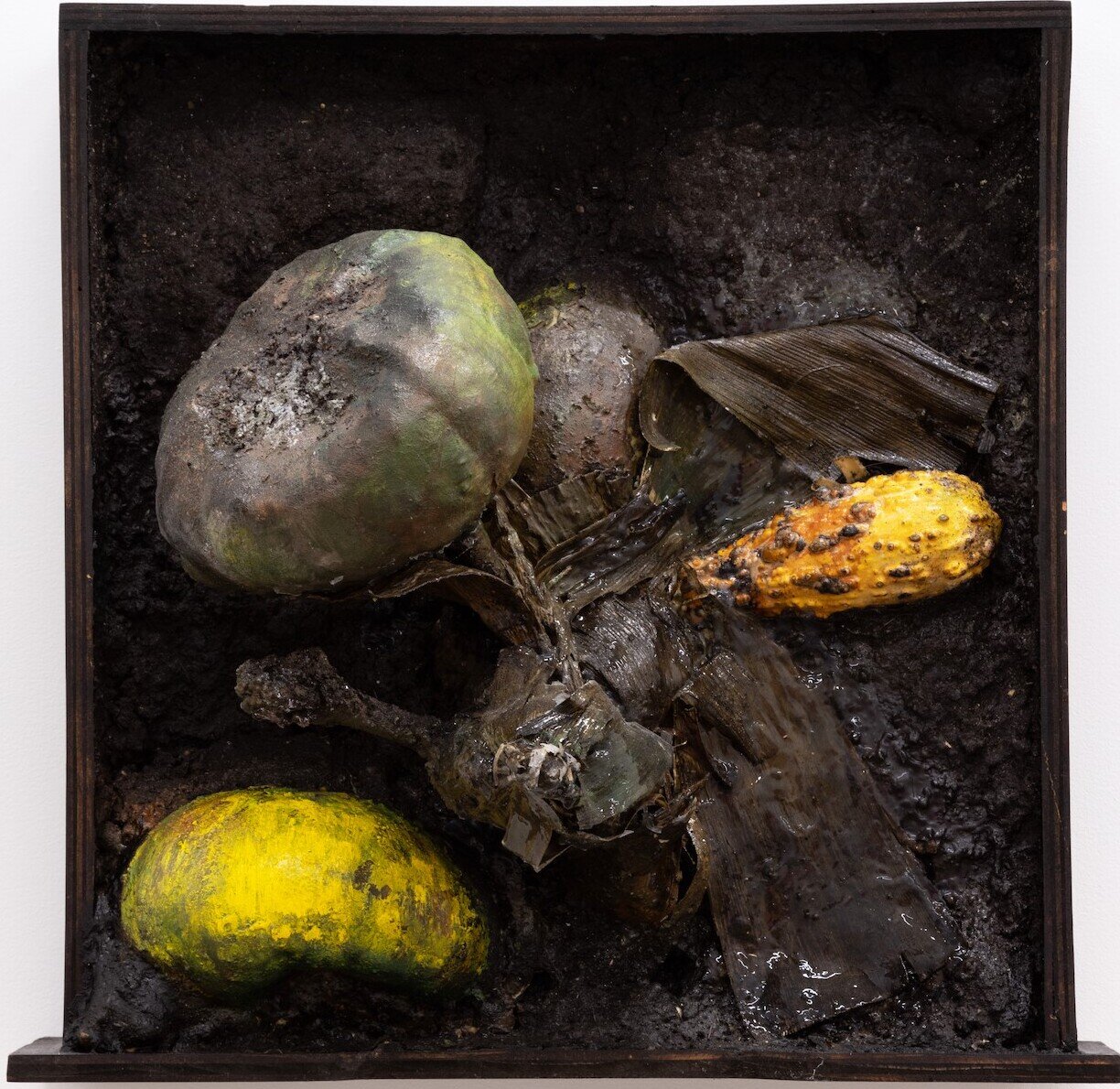 The gallery also features Brandon Ndife’s re-creation of compost, with soil and decomposing gourds. Made of wood, cast foam, pigment, and various other materials, it is very life-like. Without close inspection, it is difficult to tell, that this is not made of organic materials. The rotting matter and dark soil are harmoniously and purposefully arranged within the frame, creating a visually pleasing composition that is at odds with the rather grotesque content.
