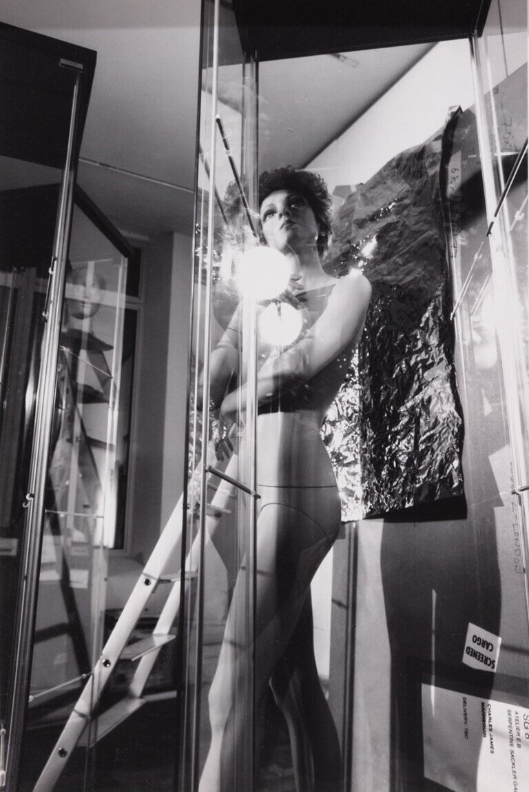 As soon as you walk into the small gallery space, you notice the bright colors and striking shapes of each different work. The first artwork you come across is Eileen Quinlan’s black and white photograph of a nude woman, or perhaps a mannequin, in a studio, surrounded by glass cases that reflect the camera flash.