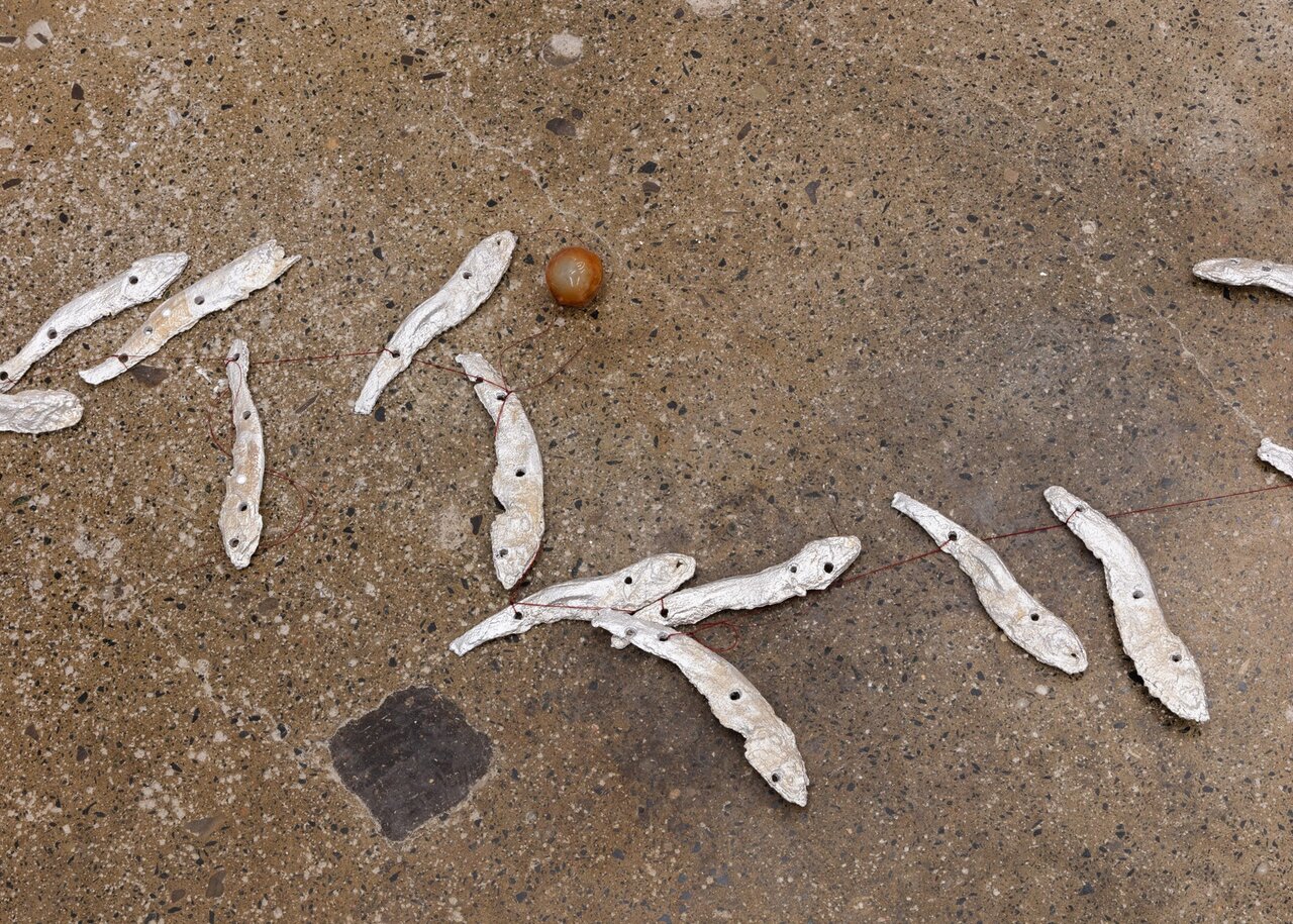 On the other end of the room Laurie Kang’s installation involves a thin thread, hanging from the ceiling and trailing along the floor, with delicate silver metal fish and rubber orange balls attached to it. The fish suspended in the air appear to be flowing along the string as they would in water, while the prone position of the fish on the floor makes them appear lifeless, and limp.
