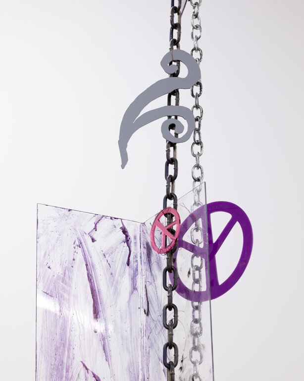 Beside this photograph hangs Raque Ford’s installation, made of two connected chains, with plastic add-ons of different colours and shapes: a clear, painted purple and grey panel, pink and purple peace signs, and a gray double spiral motif. This work is both playful and sombre, its colourful, lively plastic pieces contrasting with the heavy, dark grey, somewhat ominous chain.