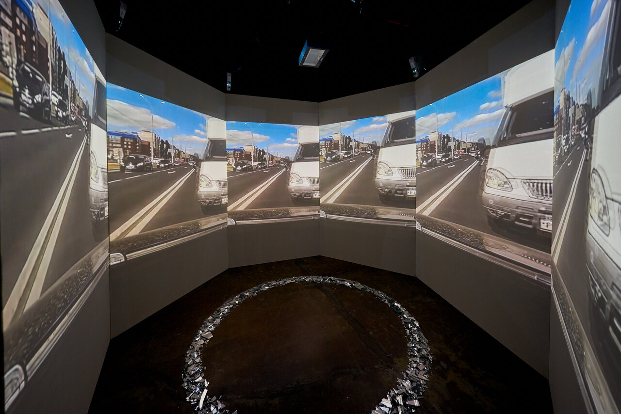 He sees technology as conspiring to make us spectators of our selves. Society is transforming into a virtual panopticon, where we act as both the inmates being observed and the guards observing. Our online lives have made us both ‘voyeurist and exhibitionist’, as Richardson puts it. This duality is directly addressed in his installation titled ‘Sphere of Influence, Circle of Protection’. You enter a space to be surrounded by screens projecting crashes filmed on dash cams. These images originate from postings of the video footage online. Why would anyone wish to share such traumatic imagery online? It is, curator Shauna Jean Doherty suggests, an extension of “our willingness to report constantly on our own location, consumer habits, and demographic information often in exchange for a free wifi signal – that connects us to a system that feeds off of an insatiable need it has manufactured.”