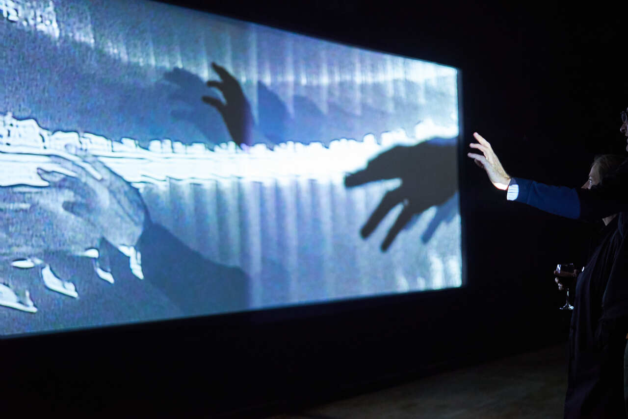Technology, it is implied, is leading to a sort of obliteration of the self. This idea is illustrated by his installation ‘The Cave’. It consists of the silhouette of an amorous couple behind which are a series of receding and increasingly degenerate video projections of themselves, which is the result of their projecting a video recording of their last sexual encounter each time they meet. By observing themselves observing themselves and so on, they ‘shift from self to object’. Slats placed in front of this video display put the gallery viewers in the position of voyeur, making them conscious of trying to spy on the scene through the gaps. The lovers on the screen too are voyeurs, that is, of what used to be themselves.