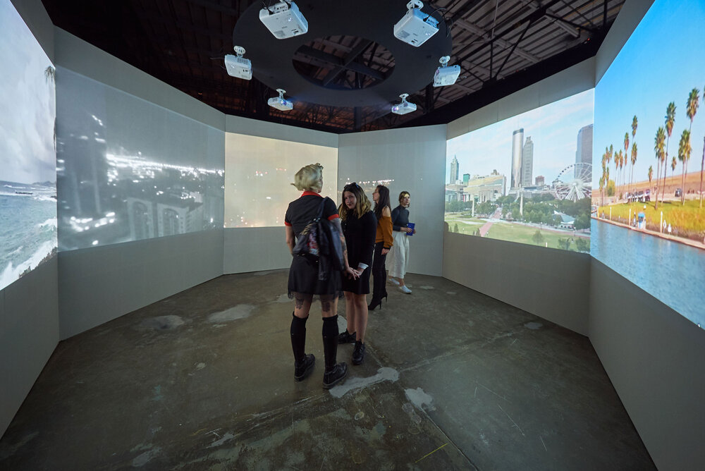 Tasman Richardson, Sands Stand Still, 2017-2019, Glass surveillance mirror, wood, paint, micro projectors, DullTech media players, induction sound, CRT static, vellum, speakers, aircraft cable, Variable dimensions
