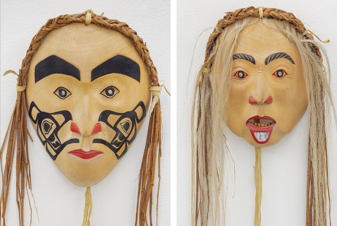 Stan Greene (b. 1953, Salish / Nez Perce), Eagle Crest Mask, alder, bark, paint; unique, 9 x 7 x 4 inches (left) & Old Lady With Labret, cedar, bark, hair, abalone inlay, paint; unique, 9.5 x 8 x 4 inches (right)