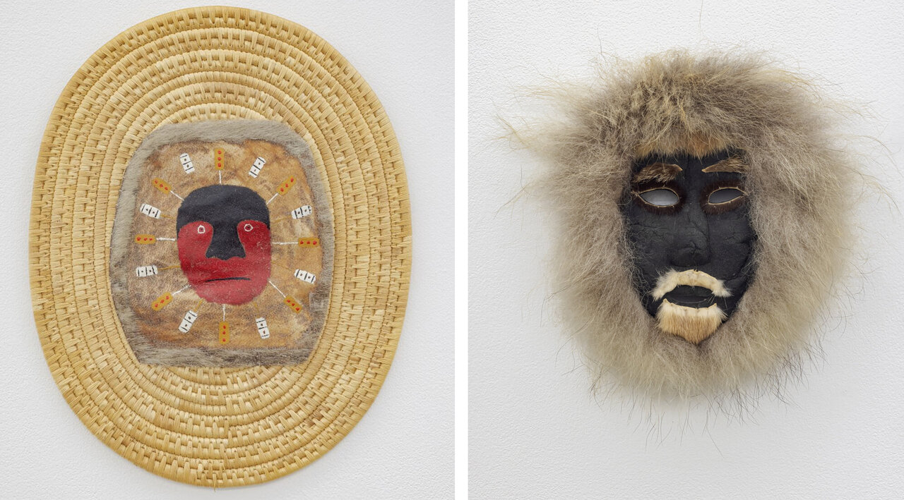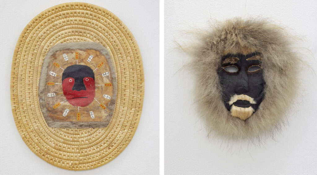 Artist Unknown (Bethel, Alaska), Spirit Mask, painted hide on woven basketry oval placket; unique, 11.5 x 9 inches (left) & Justus Mekiana (Anaktuvuk Pass, Alaska (1929 – 2009), Inuit Death Mask, caribou hide with fur trim, beard and eyebrows; unique, 10 x 8 inches approx. (right)