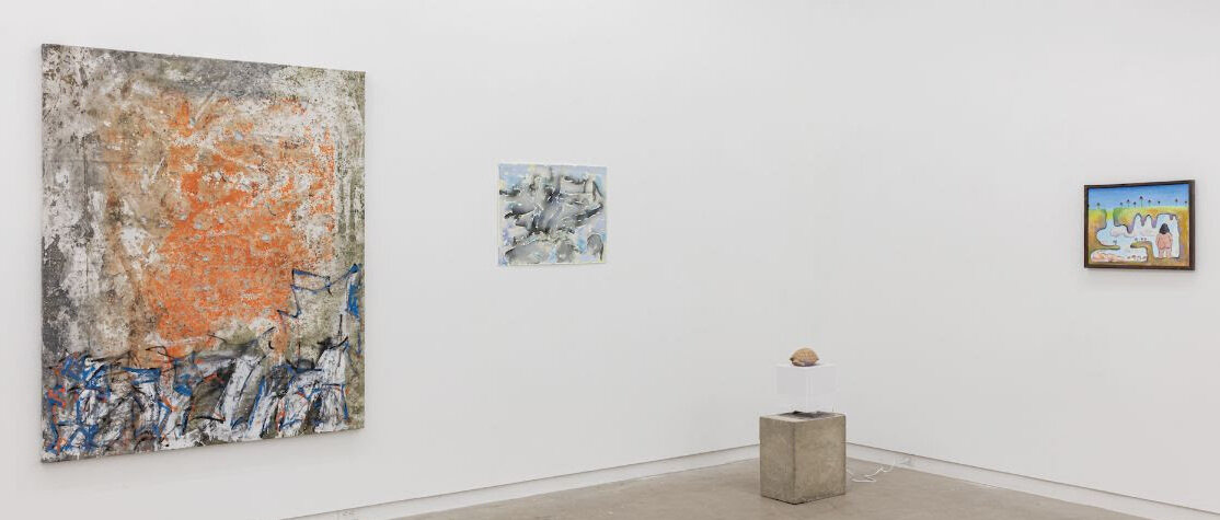 Installation view with Niall McClelland, Untitled, mixed media on canvas laid down over canvas, 60 x 72 inches (left)