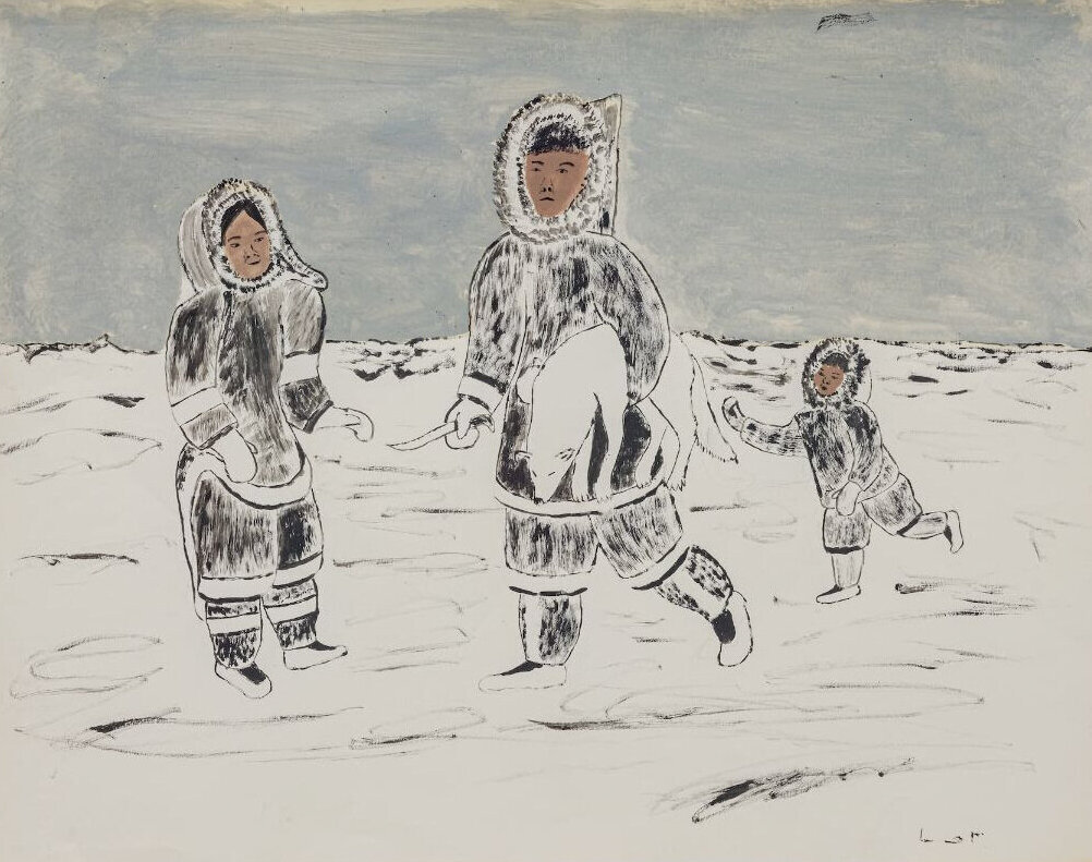 Mannumi Shaqu (1917 – 2000), Cape Dorset / Kinngait, Fox Hunter And Family, c. 1975, acrylic on paper, 20 x 26 inches