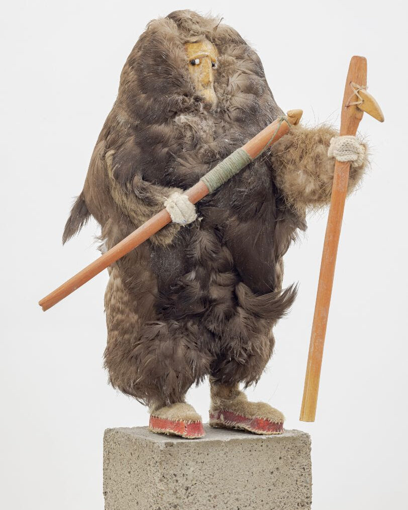 Artist Unknown (Bethel, Alaska), Yup’ik Doll Made From A Bird (Standing Hunter with Harpoon and Gaff), hide and feathers of a willow ptarmigan, wooden implements; unique, late 20th century, 11 inches tall