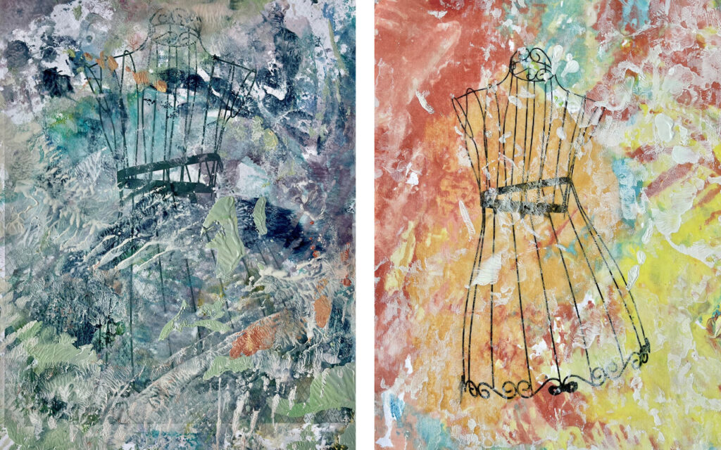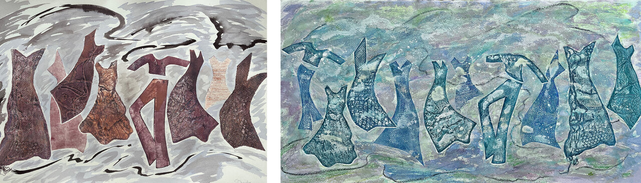 Sharon Dembo, Let’s Dance I, 2022, monoprint and ink, 15” x 22” (left) and Let’s Dance II, 2022, monoprint and encaustic printing, 15” x 30”