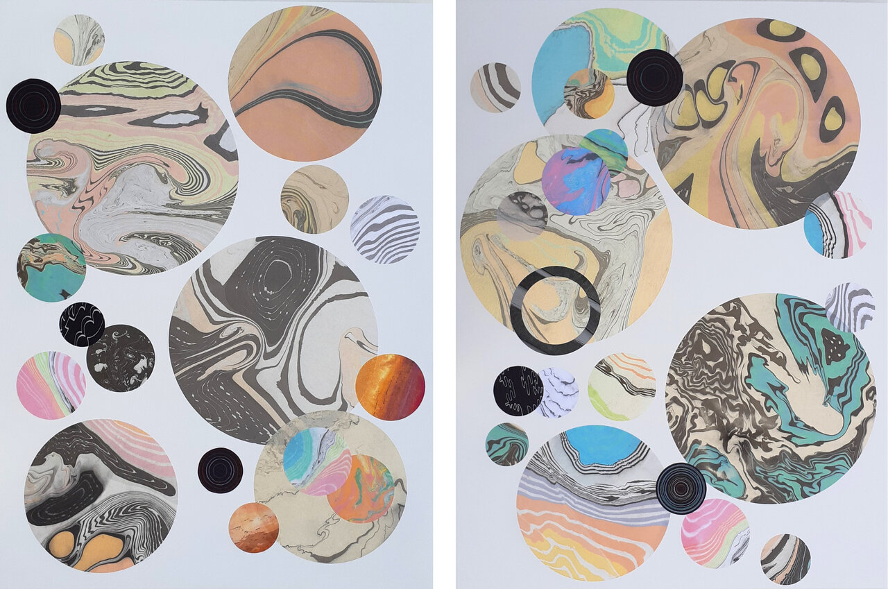 Dominique Prévost, Circle XVIII zebra (left) and Circle XXI (right) both 2022, washi and stock paper, ink and crayons, 30” x 40”
