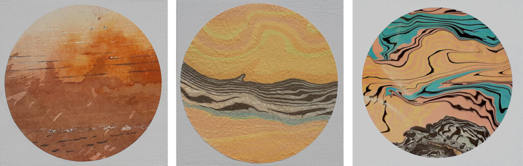 Dominique Prévost, (L-R) Burnt Sienna, 2022, heritage washi, graphite and ink, 5 x 5″, Yellow Orange, 2022, washi paper and ink, 5 x 5″ and Salmon Turquoise, 2022, Kitakata washi and ink, 12” x 12″