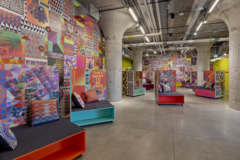 Jeffrey Gibson, I AM YOUR RELATIVE, 2022. Installation view, MOCA Toronto. Courtesy Jeffrey Gibson Studio, Kavi Gupta Gallery, Roberts Projects, Sikkema Jenkins & Co. and Stephen Friedman Gallery. I AM YOUR RELATIVE is co-commissioned by MOCA and the Toronto Biennial of Art
