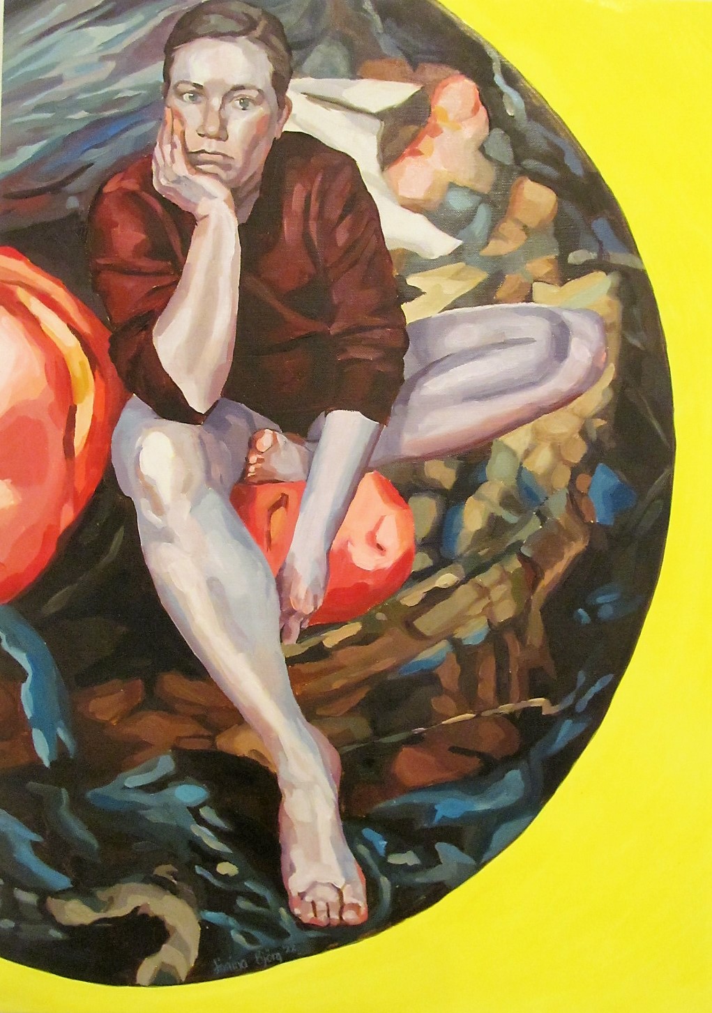 She professes that “Everything means something. Nothing is without purpose”. Indeed, where she is the principle figure in her paintings, there is a lot we can read into them. Her expressions in the colourful paintings follow her wandering thoughts and occasionally seem to stare back at the viewer. They are playful and not without humour. My two favourite works are Swims and Waits. The artist is the central figure in both. In Swims (Syndir) we see two portraits of her in sitting positions. In the one on the right side, the figure is looking down slightly, and seems to be immersed in her thoughts, while the other one turns her head up with an expression of surprise. There is a swimmer at the top of the canvas. In fact, there are several works in her show that have swimming as a backdrop. In Waits the artist sits in the middle of the composition surrounded with a strong yellow half circle. Yellow conveys energy in her painterly vocabulary, while the circle stands for repetition. The circular background behind her body might be the Earth or her personal surroundings. Sitting in the middle of that chaos, she looks on at the viewer with some kind of expectation.
