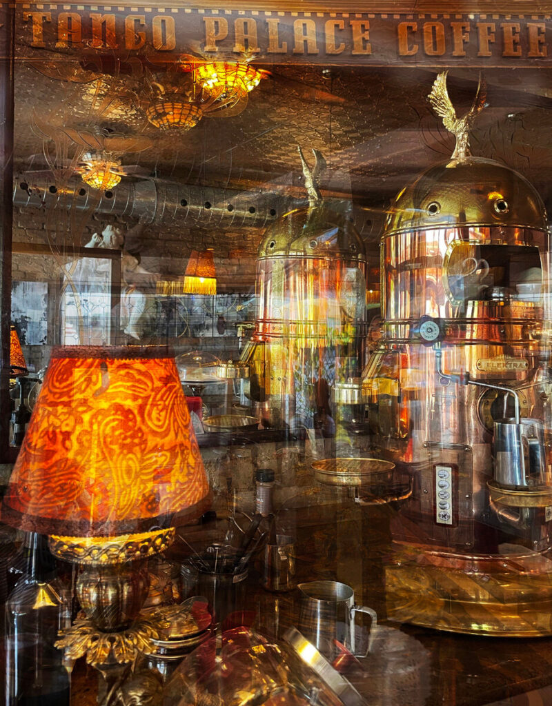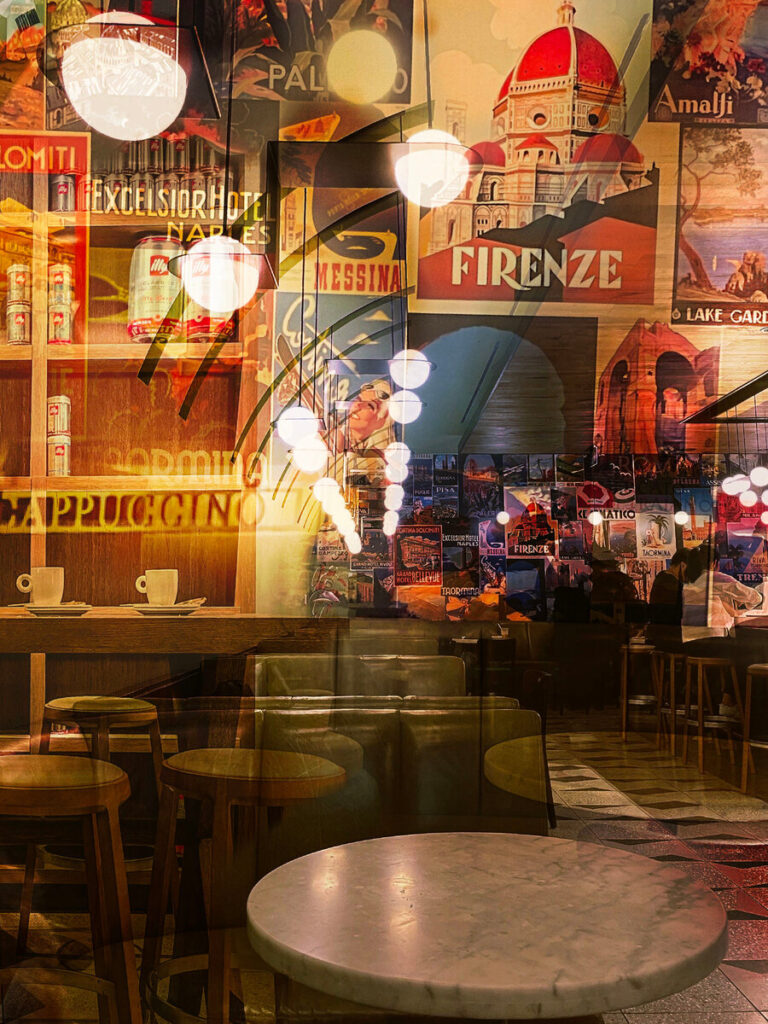 Eataly shimmers with transient light, capturing what it is to fondly recall a space as charming as Eataly’s Il Gran Caffè. Parts of the salon wall of Art Deco posters translucently hover over (or under) rows of the modern light bulbs and abandoned coffee cups, eliciting a peaceful recollection for even those who have yet to visit the space. Margaret Gdyczynski’s inspiration behind her photography stems from the richly decorated interiors of old basilicas in Florence, where she studied art. Now, she explores the spaces Toronto has to offer while searching for the perfect cappuccino. How fitting it is, then, that her exhibit is presented proudly on the wall in the comfortable atmosphere of Extra Butter Coffee.