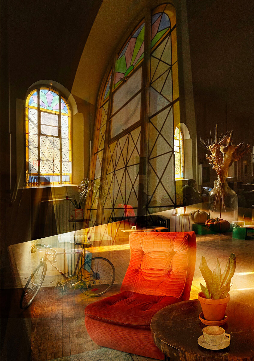 Each photograph has one exposure as an identifier, which captures the main setting of the space. Then, in aggregation, other impressions of the interior layer on top. These layers display the space’s distinct characteristics: there is the French-inspired interior design of Maison Selby; the classic copper espresso machine in Tango Palace; and the vintage furniture in The Sonndr Café. Together, these combined images blend – the way our memories do – into one moment captured in time. The slight ambiguity created from these multiple exposures suggests fleeting and vague moments, but warm ones. This is what elicits such pleasant nostalgia in the viewer. True to the explorations in her work, Gdyczynski’s exhibition echoes how memories are conjured in the mind: details drift across unrelated events, faint particulars wave in and out of focus. The permanence of indoor lighting, juxtaposed with the impermanence of daylight, parallel the workings of memory; simultaneously fixed yet fleeting.