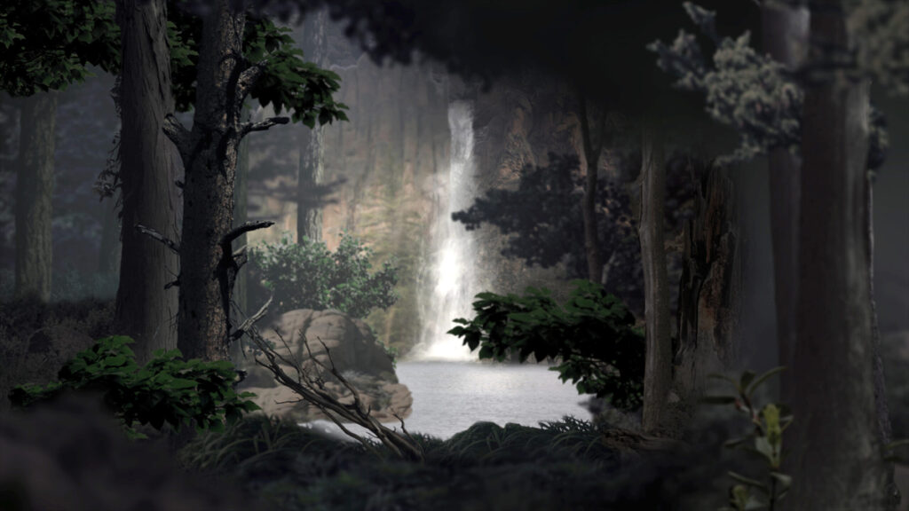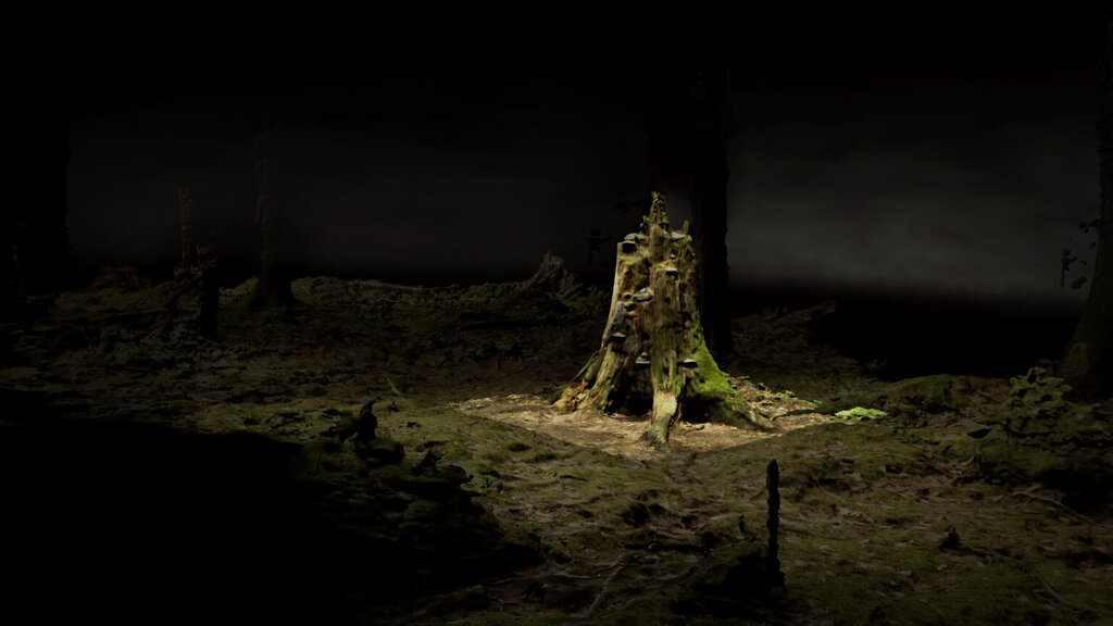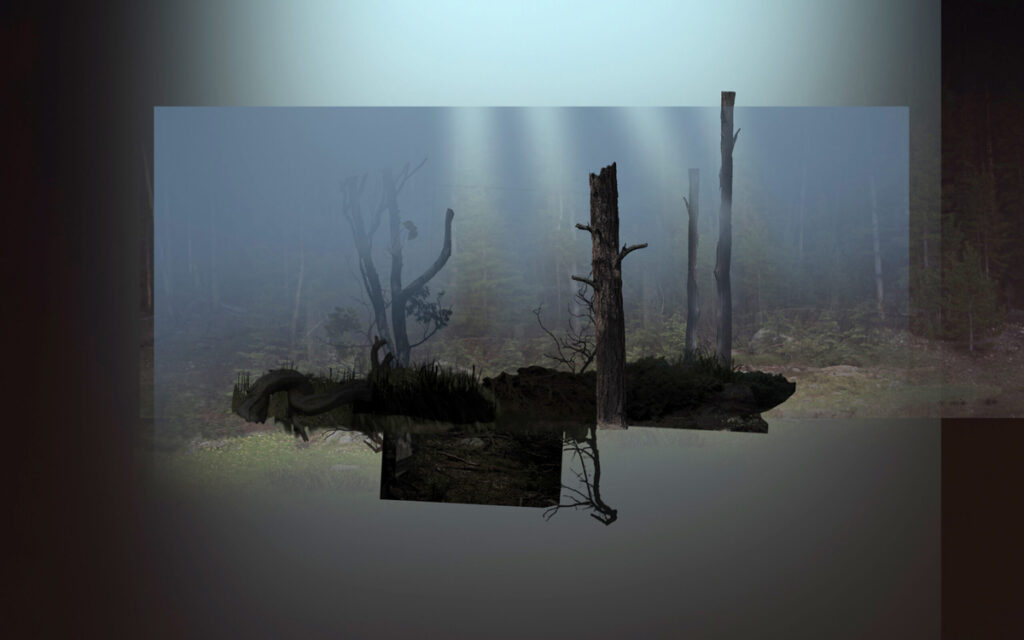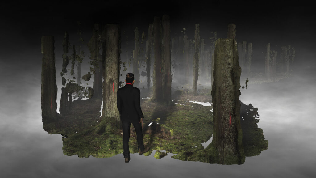 In Forest on Location they have created a pared down, dark simulacrum of a forest modelled on photographs from the famous Białowieża forest that spans Poland and Belarus. It features a ghostly avatar of Iranian opera singer Shahram Yazdani passing through fragments of trees, soil and rock, while singing a haunting version of ‘Nature Boy’ in Farsi – a song made famous by Nat King Cole in 1948. In Mastering Bambi Broersen and Lukács use similar digital technology to create an eerie version of scenes from the Disney animated film Bambi (1942). Its eeriness derives from the absence of any fauna in the forest, in contrast to the original Bambi film which features countless cute animals bounding through the woods.