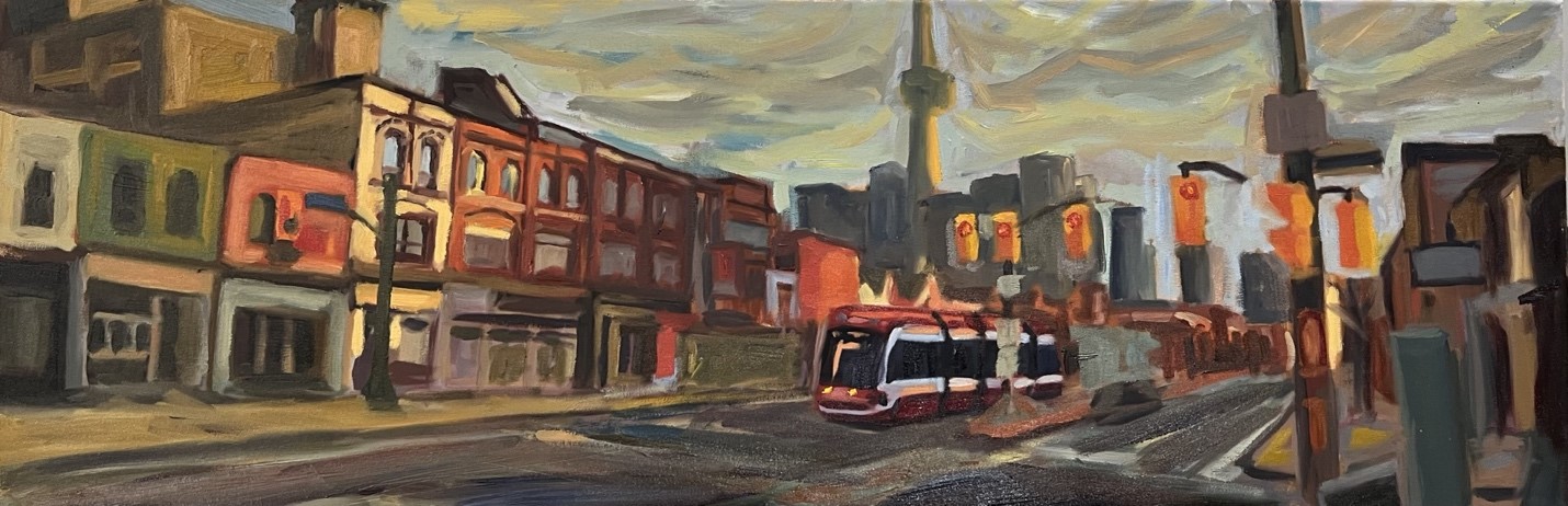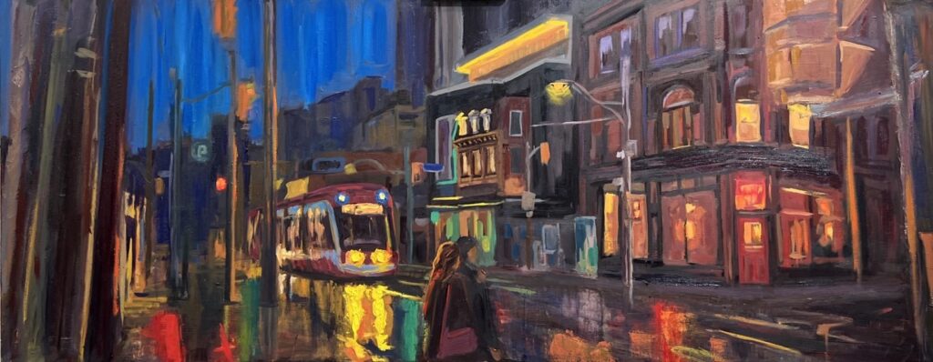 Jarrod Bai’s “Chinatown” and “Neverland” are a testament to the emotional depth of Toronto’s cityscapes. With their rich, deep brushstrokes and warm, muted palettes, Bai’s work not only capture the iconic scenery of Toronto’s streetcar neighbourhoods but also infuses them with solitary, dreamlike reflections, and the melancholy glow of twilight.