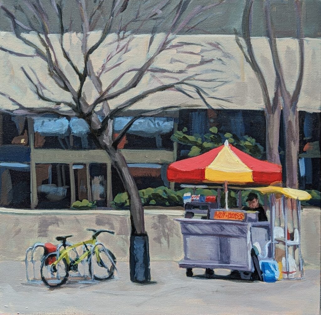 Alex Salzmann, Hotdogs in the Concrete Jungle, acrylic, 16 x 16 inches