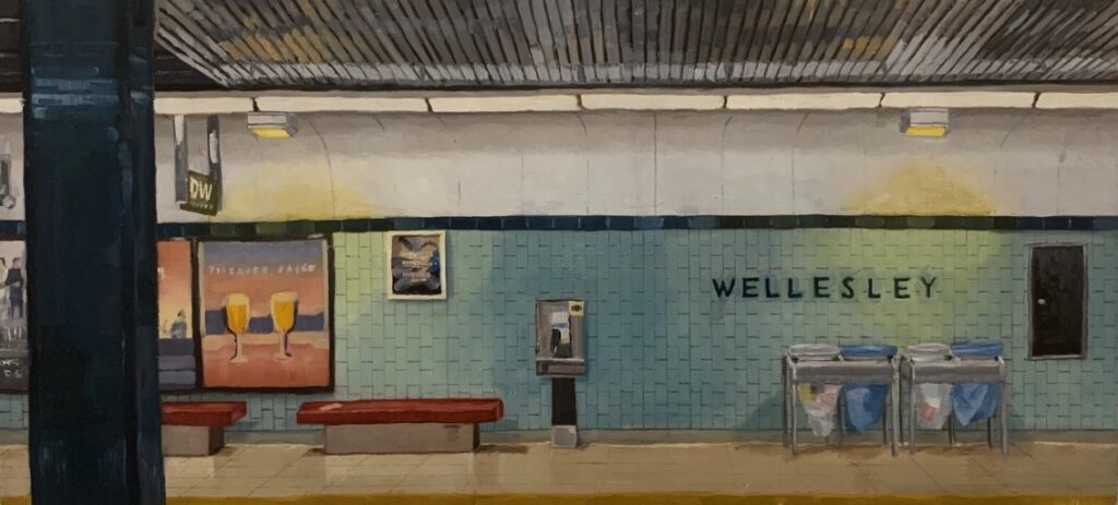 Anshul Sharma’s “Why Wellesley,” takes us on a journey into the city’s underground, portraying the eerie stillness of Toronto’s subway system. This captivating artwork mesmerizes with its smooth, subtly textured surface. It provides the perfect backdrop for the striking contrast between the stark white and vibrant teal tiles on the subway platform.