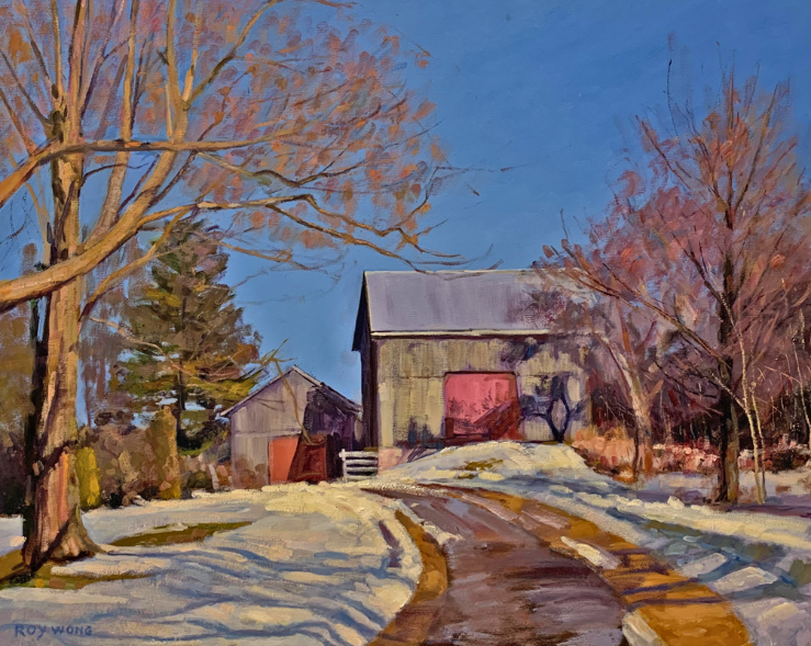 Roy Wong, Red Barn in the Fall, acrylic and oil on canvas