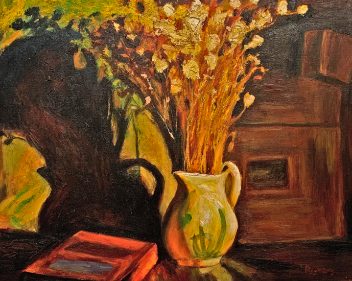 Yet, this isn’t a somber reflection. Pops of bright yellow and blue traverse the canvas like unexpected wildflowers erupting through a weathered landscape. These bursts of colour bring a sense of vibrancy and life, reminiscent of the flowers in the still-life work. The composition feels dynamic, a swirling interplay of textures and hues.