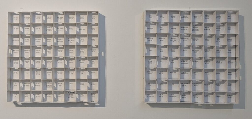 Gallery Space, 1988 (left) and Gallery Space 2025 (right) both house paint on mahogony panel and card, laser transfer text, 14 x 14 x 2 inches. Photo: Hugh Alcock