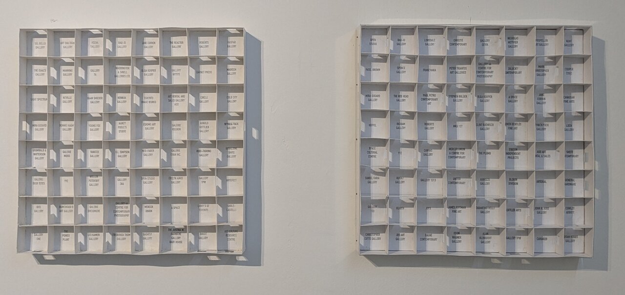 Rockwell’s performances on the theme of galleries goes back to about a decade earlier. In 1988 he decided to drop by at 64 of Toronto’s galleries, and ask their owners or administrators to fill out a form indicating in which direction their main entrance faces – north, east, south or west. Using the information he received he built a model, displayed on the wall, representing each gallery as a compartment on a square grid. A small aperture on the respective wall of each indicates the direction of the entrance. Here one is reminded of Sol Le Witt’s work, e.g., his permutations of the edges of a cube. The appearance of the material art object is entirely determined by the rules underwriting its construction. Indeed, Le Witt has been a major influence on Rockwell. This year Rockwell repeated the performance. In the updated version he struggled, sadly, to find 64 galleries in the city.