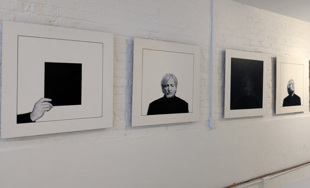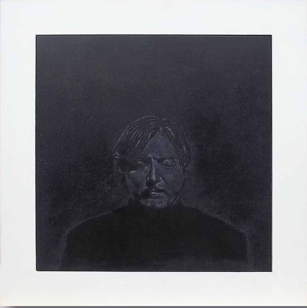 While these works are not literally biblical in derivation, they do touch on big questions – on life and death specifically. In Blackout we see a grainy barely discernible image of Rockwell’s face. It inspired by an episode while visiting and meditating on a gallery space when he was suddenly plunged into darkness, due to a power outage of course. In his depiction of this event Rockwell chose to render himself, despite the almost total darkness, as a comment on our perception of darkness. As Rockwell points out, normally – at night, closing our eyes etc., – we do not in fact experience total black. Instead we ‘see’ what are sometimes called phosphenes, namely internally generated patterns. The image of his face that we see imitates this experience. Only death leads to true blackness in this sense. Likewise, light is obviously associated with life. Hence Rockwell’s choice of painting in black and white – emblematic of pure light and darkness, i.e., life and death.