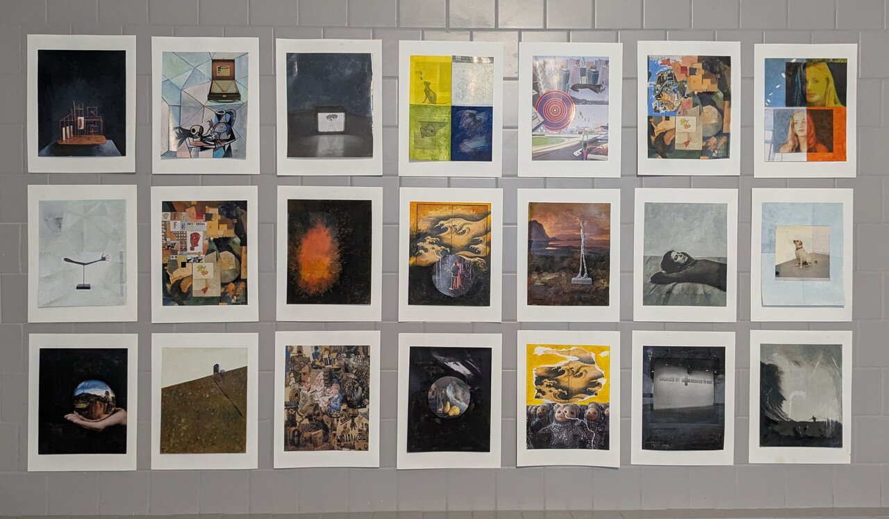 Installation view with collages, each 2025, dArt pages with oil, 7 x 8.5 inches. Photo: Hugh Alcock