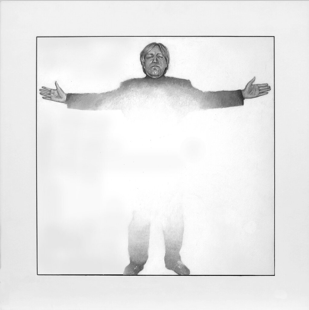Rockwell’s show is about art. It is, one might say, second order art. Moreover it is a breed of conceptual art, based on performance of a peculiarly inconspicuous kind. Rockwell’s work invariably has some story behind it. For instance, in one of his black and white paintings, one confronts an image of the artist himself, arms fully spread, with bright light radiating from his torso, titled My Spirit Lives Here! (1996). Nearby is another image of him, titled Blackout, which in contrast to his effulgent self, has him shrouded in darkness – his features barely discernible.