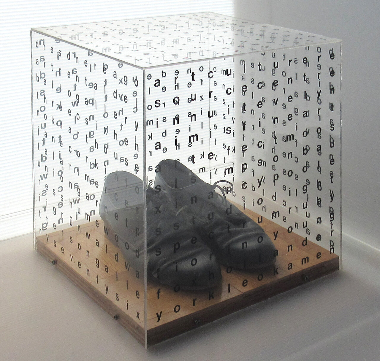 Gallery Space (Shoes), 1988, acrylic, wood floor, shoes, 14 x 14 x 15 inches. Courtesy of the artist