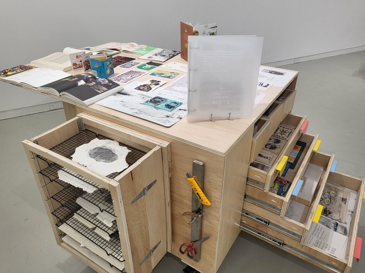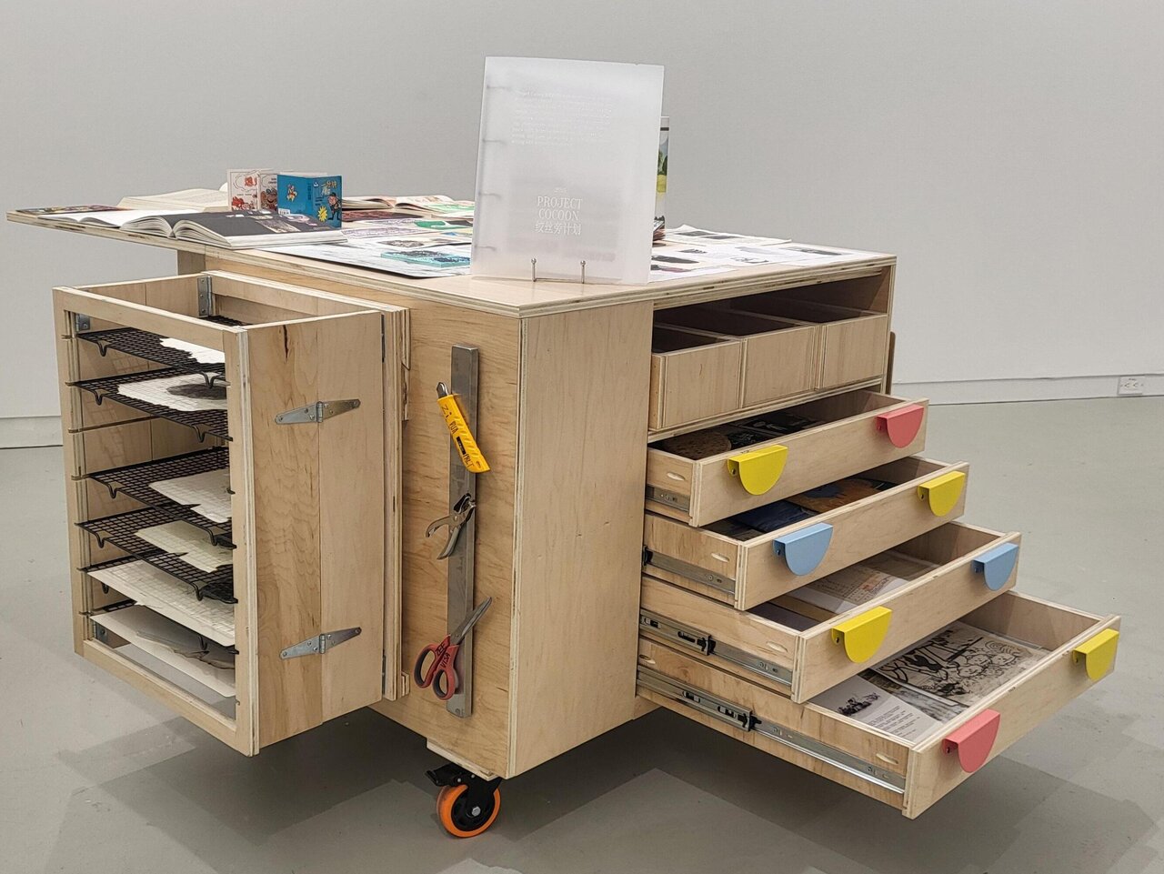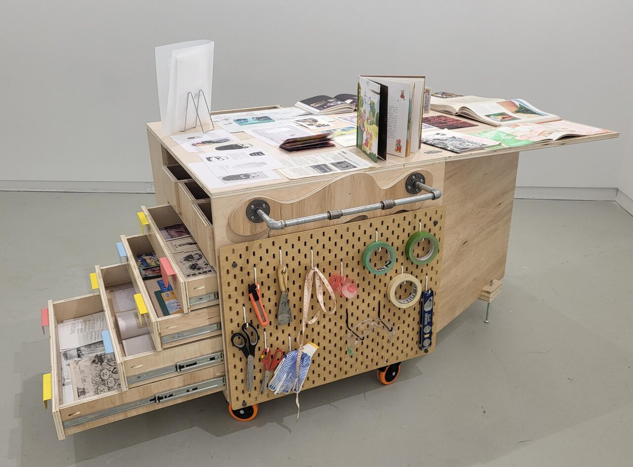 If Inside Travel Land holds the weight of individual migration stories, Cancanvan turns outward to collective practice. Designed as a mobile workshop cart built from Canadian maple and metal, it folds and unfolds with ingenuity: drawers for stools, a pegboard for tools, a collapsible drying rack, and a surface that doubles in size to display artist publications. Compact enough to pass through most doors and vans, it functions both as a portable print studio and as a traveling gallery.