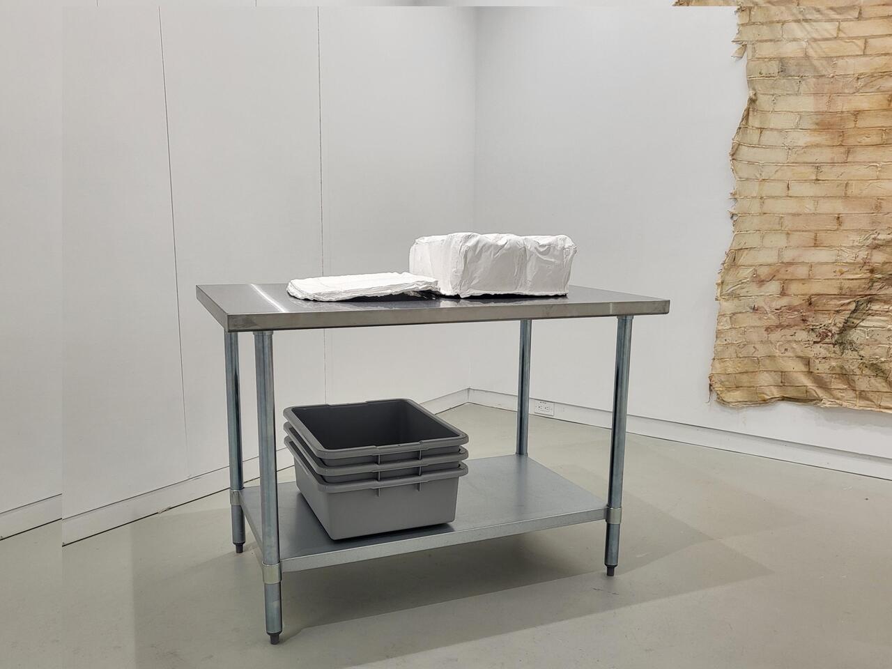 Inside Travel Land presents a cold, steel airport security table with stacked plastic trays beneath and, on top, a plaster cast of the hollow interior of a suitcase. At first glance, it reads like an ordinary border checkpoint. But as Wang explained, the quick decisions made at these tables—what to keep, what to discard—can be laden with memory and loss. She recalled her sadness at surrendering a pair of childhood scissors to security. The plaster cast, fragile yet firm, embodies this paradox: absence as presence, and vulnerability as strength.