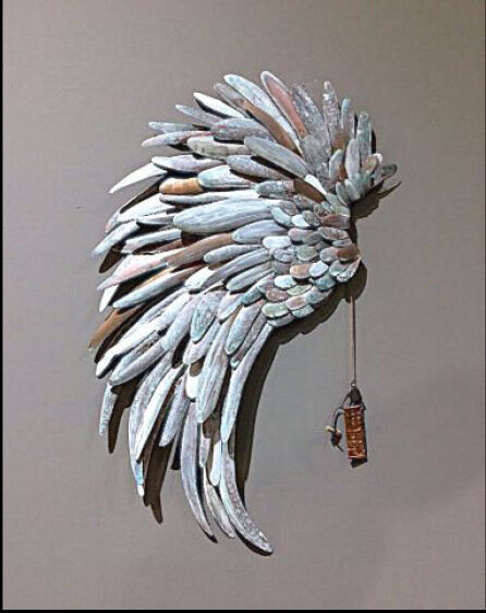Dina Torrans’s Heirloom #11 – Wish mobilizes the motif of the wing as both structure and metaphor, assembling layered copper elements into a form that suggests movement while remaining fixed in place. The patinated surfaces register time through variation in tone, producing a stratified texture that evokes accumulation. The wing’s curvature directs the viewer’s gaze downward toward the suspended object, which interrupts the expectation of uplift with a counterweight that is materially grounded. Formally, the work stages a tension between expansion and restraint while emotionally, it operates in a minor key: the piece evokes longing without spectacle, articulating “wish” not as triumph but as a deliberation between desire and the weight of what is carried forward.