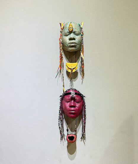 Karen Stoskopf Harding’s Great Fertility Goddesses with Talisman Pouch & Pomegranate approaches fertility as a constructed and ritualized framework rather than a symbolic abstraction. Executed in encaustic, the vertically aligned heads adopt a frontal, mask-like presentation that suspends expression and emphasizes endurance and invocation. The chromatic contrast between the upper green form and the lower red form introduces a cyclical logic while the suspended talisman and pomegranate function as material signifiers of offering and embodied knowledge. Ornamentation and appendage extend the work spatially, positioning the interval between the two forms as an active site of meaning. The emotional effect is one of restrained gravity because the work elicits contemplation rather than empathy, confronting the viewer with fertility as a condition structured by obligation, ritual weight, and psychological intensity rather than generative ease.