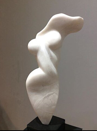 Elizabeth Merei’s Silhouette distils the human figure into a continuous, upward-pressing form, where mass and void are calibrated with restraint. Carved in Italian marble, the sculpture rejects anatomical specificity in favour of a compressed corporeality: the torso twists subtly, shoulders and hips implied rather than visually declared, producing a tension between weight and lift. The polished surface absorbs light softly, smoothing transitions between planes and emphasizing the work’s internal rhythm rather than its outline. Emotionally, the piece registers as insistent. Its attenuated posture suggests vulnerability without fragility, as if the figure is both gathering itself and resisting collapse. The effect is intimate, inviting a slowed, bodily response from the viewer, who encounters the sculpture less as an image to be read than as a presence to be felt.