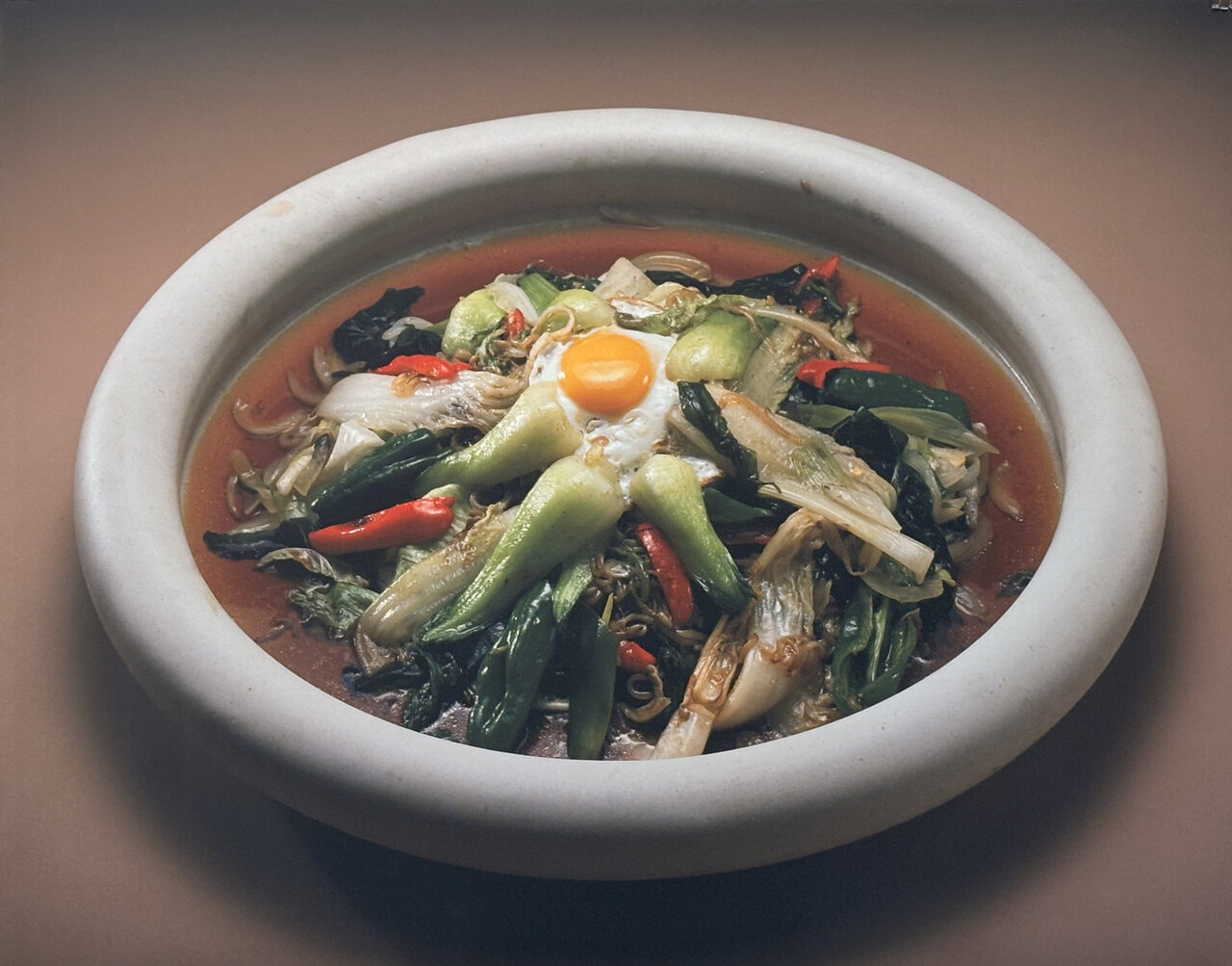 Kosen Ohtsubo, Can Frizzling Vegetables Be Avant-Garde Ikebana?, 1988, bok choi, cabbage, egg, noodle, shishito, pepper, ceramic vessel made by Mobach Keramik. First published in xContemporary Ikebana Today Vol. 1, May 1989. Photographed by the Ryusei Photo Department.
