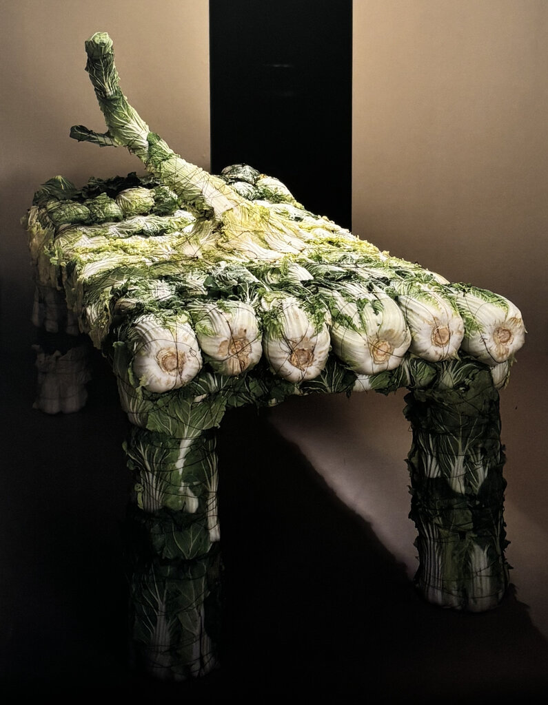 Kosen Ohtsubo, Chinese Cabbage Table Crazy Night, October 1992, Chinese cabbage, wooden table. Exhibited at the Ikebana Ryusei Exhibition: Another Flower, Matsuzakaya, Ueno, Tokyo. First published in the December issue of Ikebana Ryusei Magazine, 1992, and photographed by the Ryusei Photo Department.