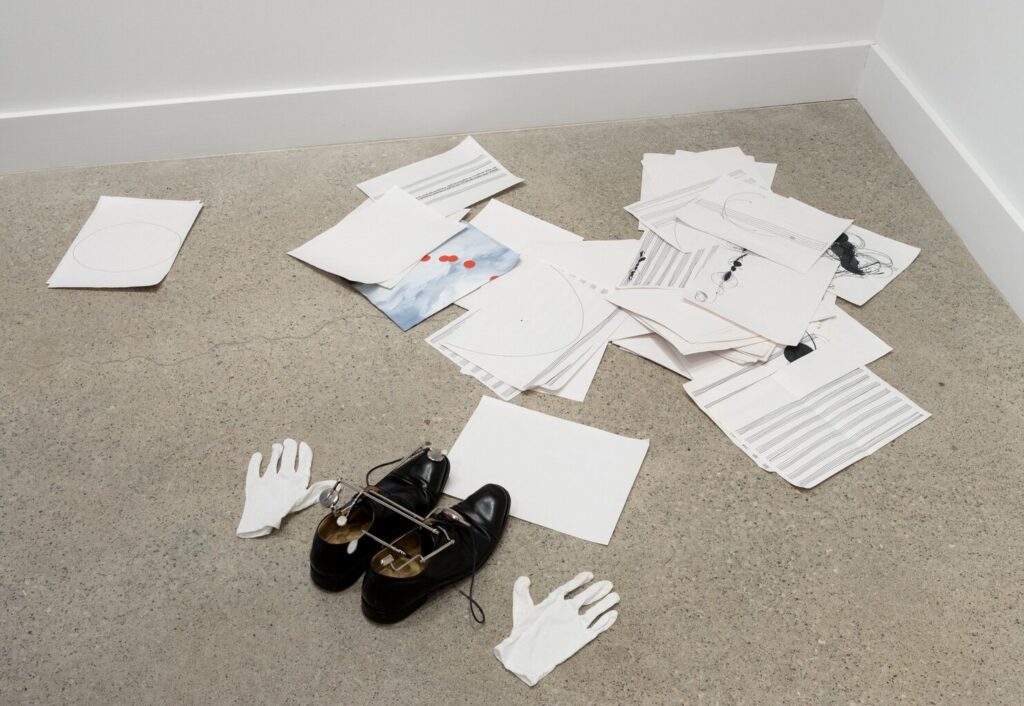 Goblins, a floor installation consisting mainly of strewn bar line paper, shoes, and white gloves suggest an invisible conductor, the imagined possibilities ranging from anything between Leonard Bernstein to Disney’s Mickey Mouse of Fantasia.