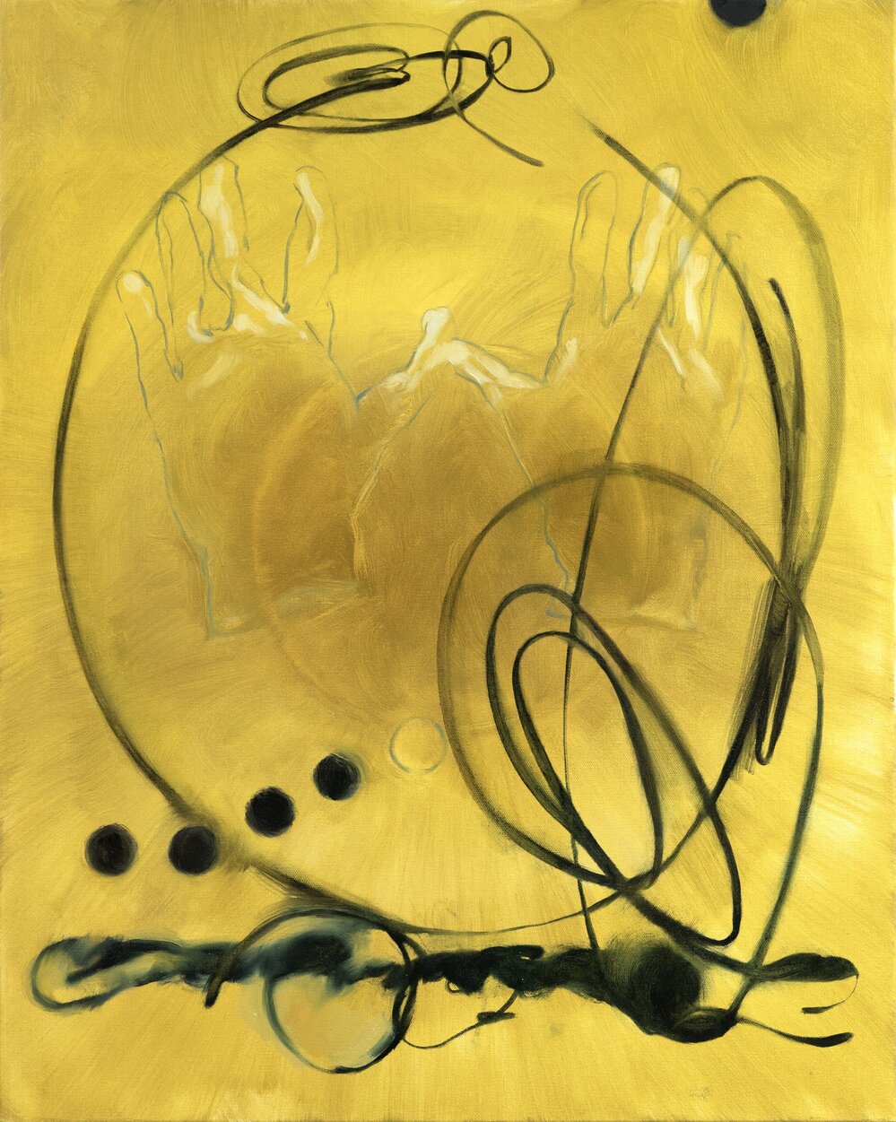An exception is Panorama, with its trail of smudged dies and looping spiral. Until the timing is felt and understood may be the “loudest” painting in the show with its tensely coiled loops rendered in black on yellow background.