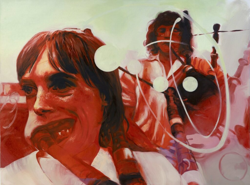 Likewise, Whistleblower features a pair of ruddy pipers, a face contorted in the act of blow, overlaid by a float of spiral and dies. Its prevalent blood vessel red might even generate a sense of synesthesia, a crossing of sight with sound.