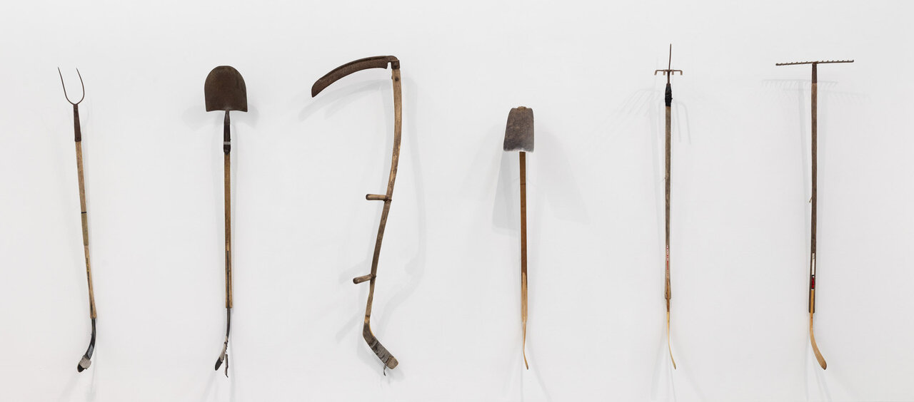 Oluseye, Ploughing Liberty, 2024-2026, Antique farm implements, found hockey sticks and brass dowels.