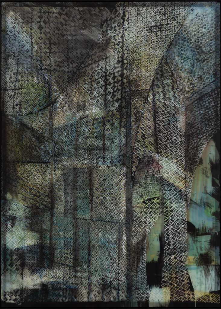 Shannon Bool, Veiled Facade, 2026, Oil, fabric paint and batik dye on silk, plexiglas mirror, 65 x 46¾ inches.