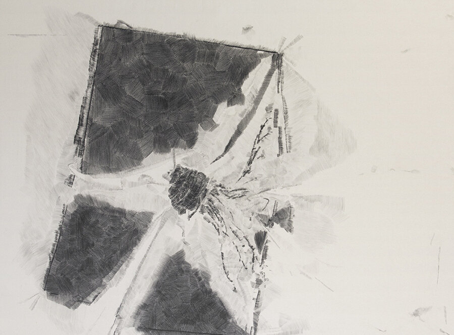 Derek Liddington, The plant proceeded to tip as I drew it, at which point I made the decision to let it fall as I felt it would improve the composition., 2015, Graphite on canvas, frame: watercolour on maple, 61 x 81 inches.