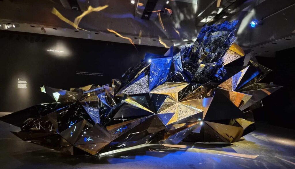 Another centerpiece, Asteroid 3033, merges natural and technological imagery. Composed of aluminum and gold-plated steel, the structure resembles a massive azurite crystal. With internal LED lights, fiber optics, and a soundscape blending Indian classical and electronic music, it feels alive—part machine, part celestial body. Sidhu imagines it as a vessel both descending to ward Earth and ascending into the atmosphere, carrying the planet’s essence into the future.