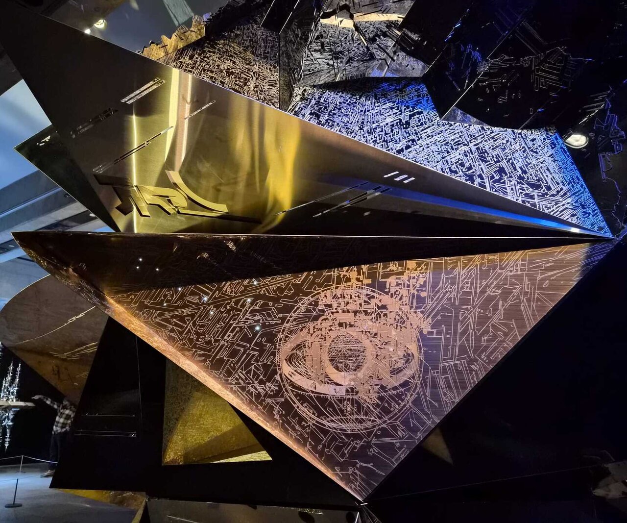 Ranbir Sidhu, Asteroid 3033, X1, 2025, stainless steel, aluminum, gold foil, fiber optics, LED, crystal (above) and detail (bellow)