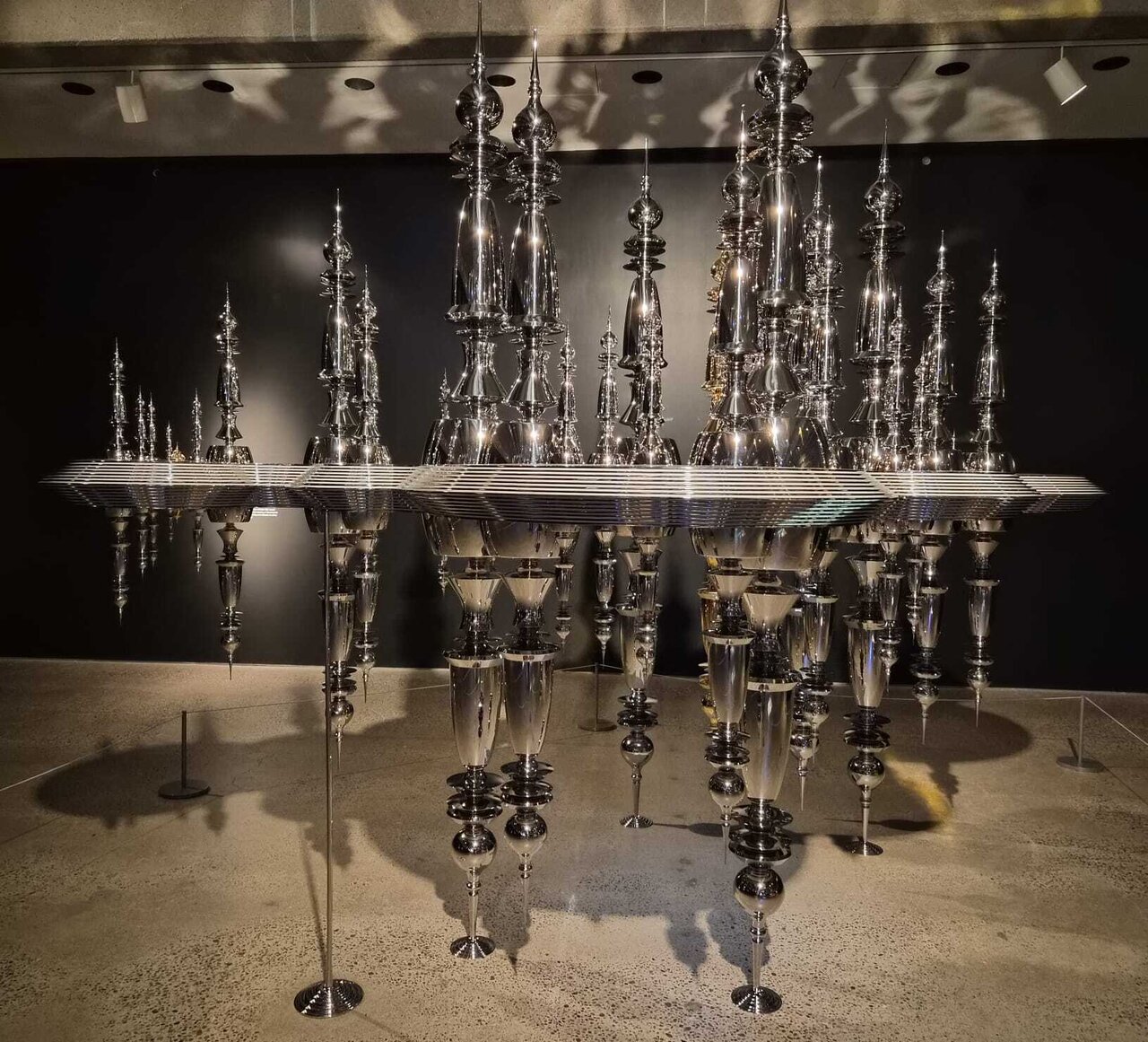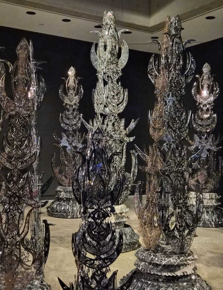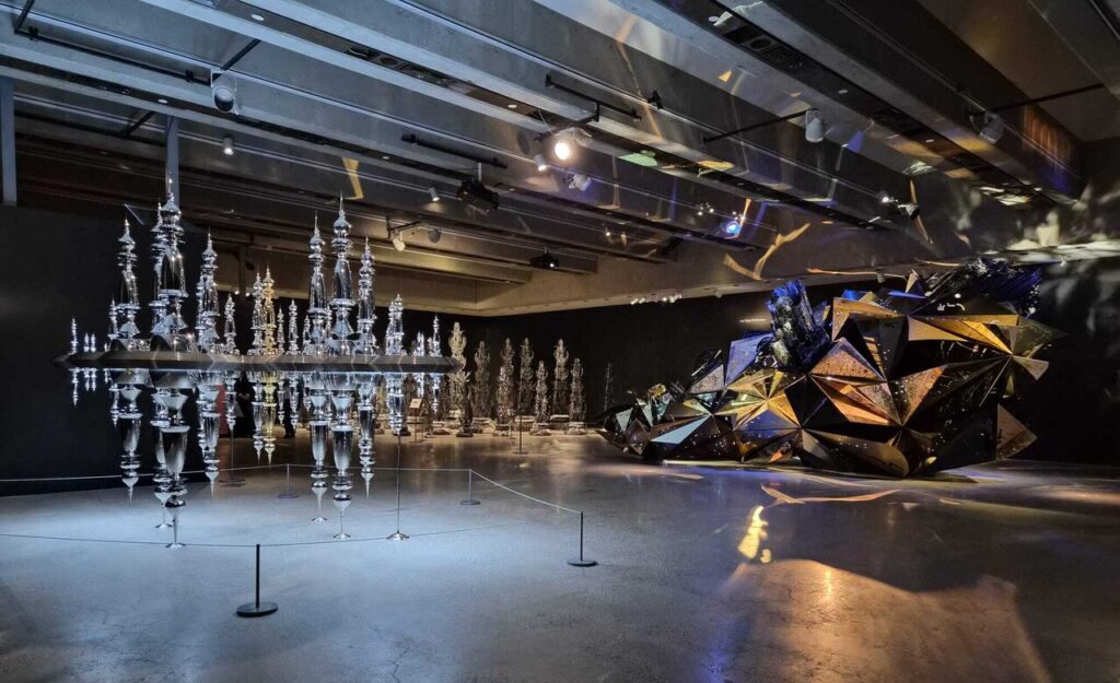 Another stunning piece, Odyssey, is an engineering and aesthetic marvel. Weighing 5,000 pounds and resting delicately on four points, it’s built from over a thousand mirror-polished and gold-plated stainless-steel components. Its design draws from Byzantine domes, Islamic minarets, Renaissance cupolas, and Sikh sacred architecture, creating what Sidhu calls a “spiritual cartography.” Seen in person, its reflective surfaces create endlessly shifting interactions of light and space—an experience at once architectural and divine.